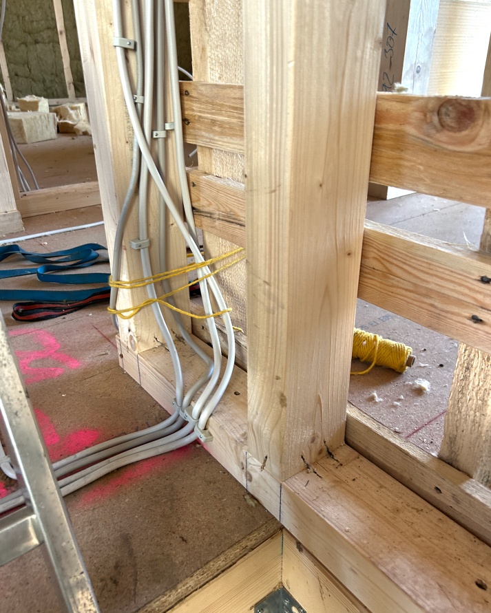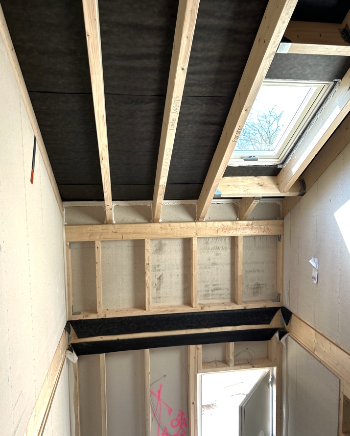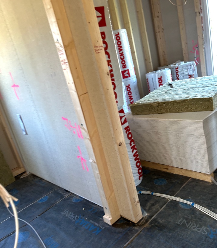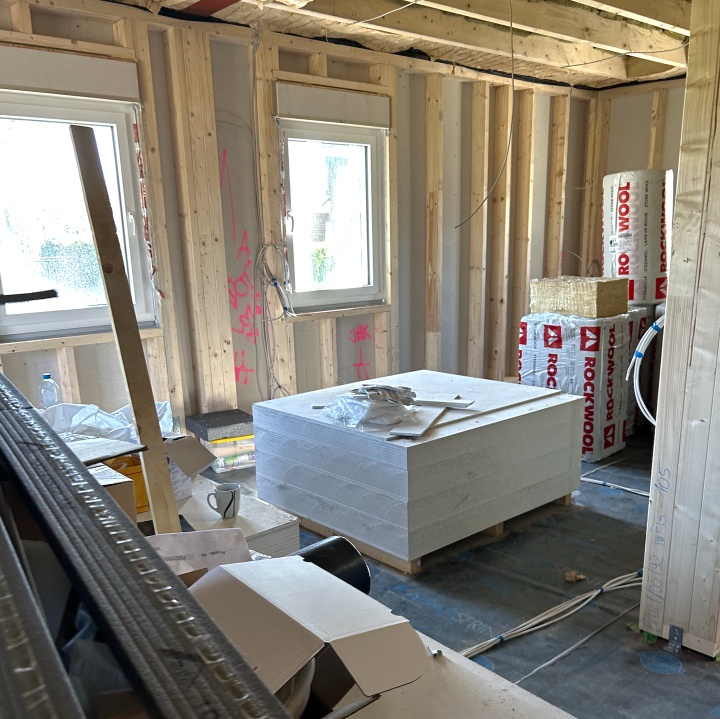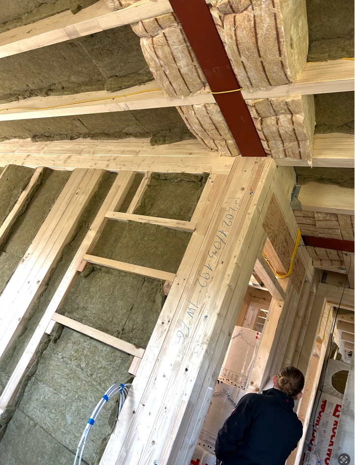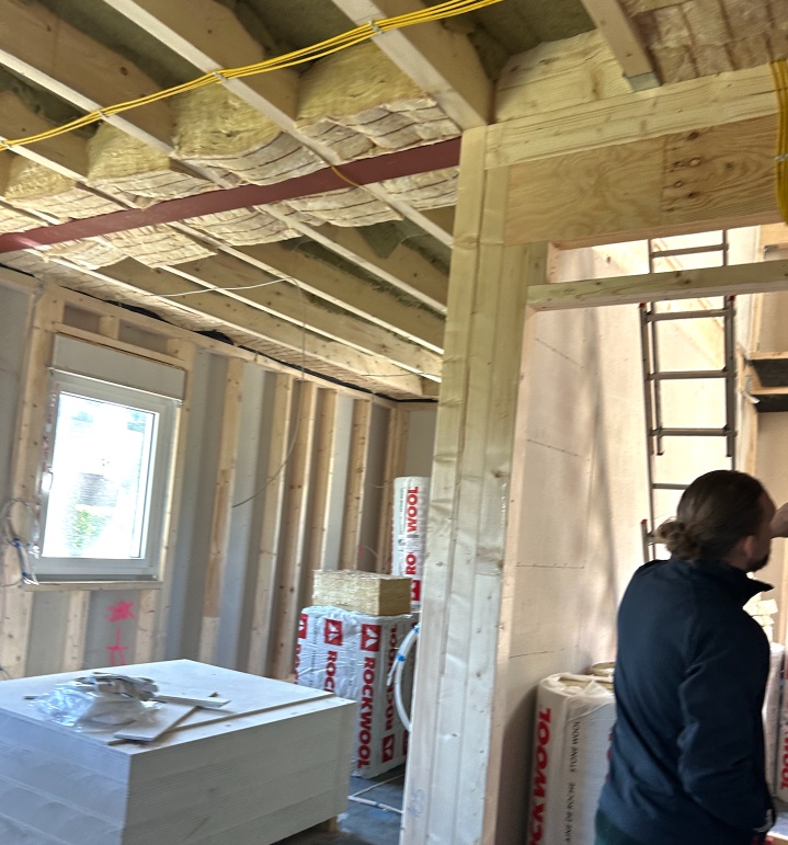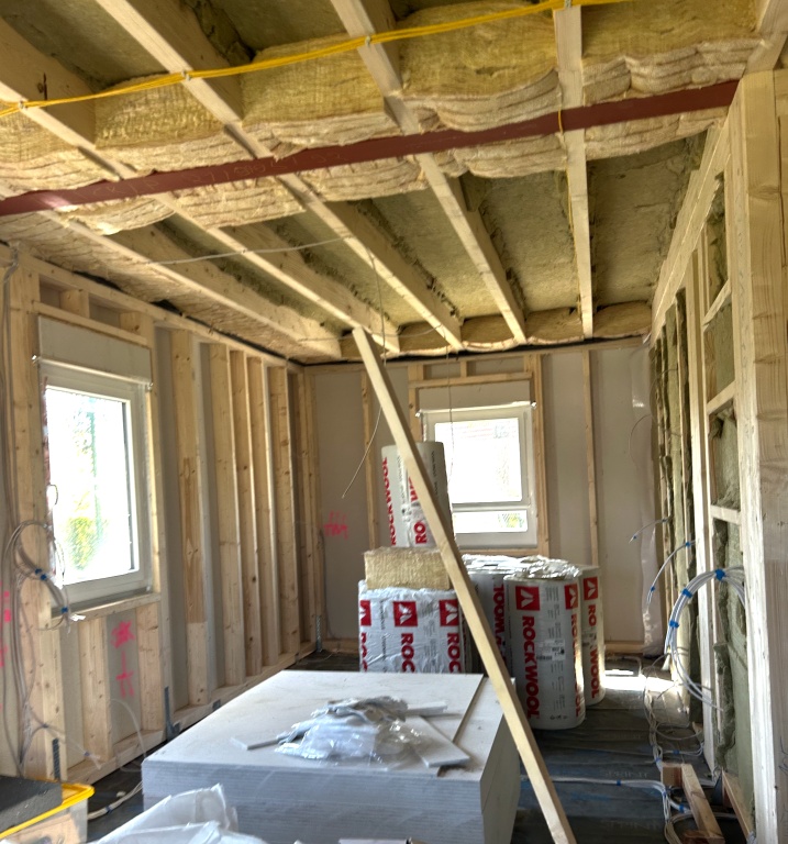 "Fachwerkhaus 2.0" (Böden: Massivholz, dann Schüttung, danach Estrich+ Bodenbelag, sowie bei den Wänden: Massivholz+ Doppelt-Fermazell und Steinwolle -> perfekte Dämmung, die die Vorschriften für einen Neubau mehr als erfüllt); hier unten ein anderes Massa-Haus, wie es schon direkt nach dem Stelltermin ausgesehen hat (Stelltermin meines eigenen Massa-Hauses: 21.-23.7.2025)